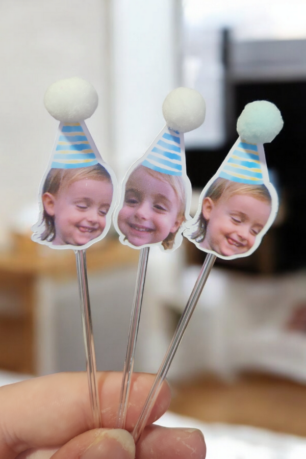 Cada peça é feita em papel fotográfico de alta qualidade, com corte preciso na Cricut, acabamento manual com pompom colorido e fixação em palito de dente.